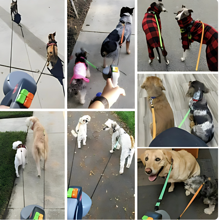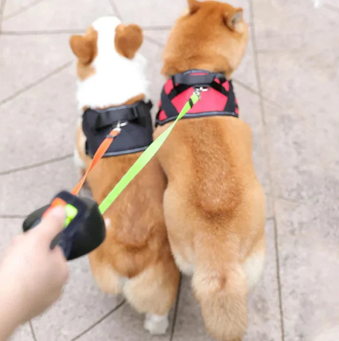 - Verstelbare lengte: De lengte van de riem is aanpasbaar, zodat u de afstand tussen uw honden kunt regelen en hen de nodige bewegingsvrijheid kunt geven.