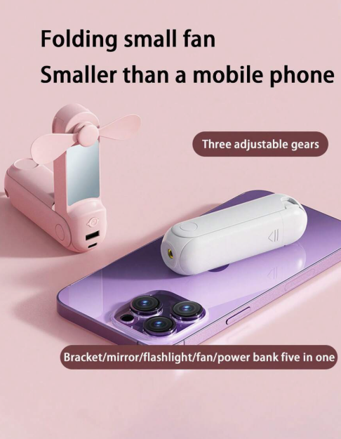 Blijf koel en comfortabel waar je ook bent met deze Draagbare Opvouwbare Ventilator. Deze veelzijdige gadget biedt niet alleen een krachtige bries, maar fungeert ook als spiegel, zaklamp en zelfs als powerbank – ideaal voor onderweg!