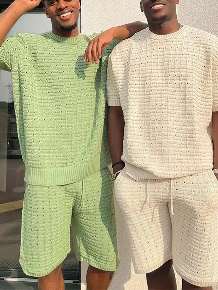 De Vinny 2-delige set is de ultieme zomerse outfit voor heren die comfort en stijl willen combineren. Deze luchtige set bestaat uit een gebreid T-shirt met korte mouwen en een bijpassende short met trekkoord, beide uitgevoerd in dezelfde kleur voor een strakke, moderne look. De ademende stof zorgt ervoor dat je zelfs op de warmste dagen koel en comfortabel blijft